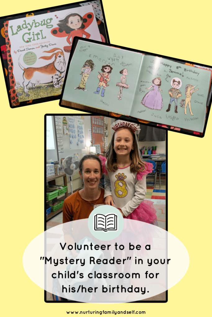 Volunteer in your child’s classroom by asking to be a “Mystery Reader” on his/her birthday.